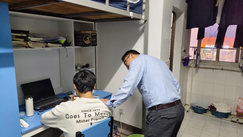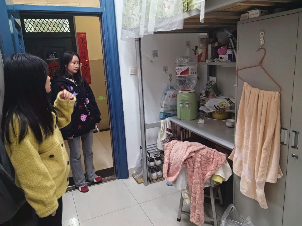 在检查中,老师们深入学生宿舍,从地面清洁、物品摆放、内务整理、空气流通、安全隐患五个维度进行细致评估。在安全检查中仔细查看了宿舍是否存在使用大功率电器等违规行为,并现场对学生进行安全教育。老师们耐心查看宿舍角落的卫生死角,针对地面污渍、垃圾堆放等问题,现场指导学生正确的清洁方法,并强调保持宿舍卫生对身心健康和学习状态的积极影响。