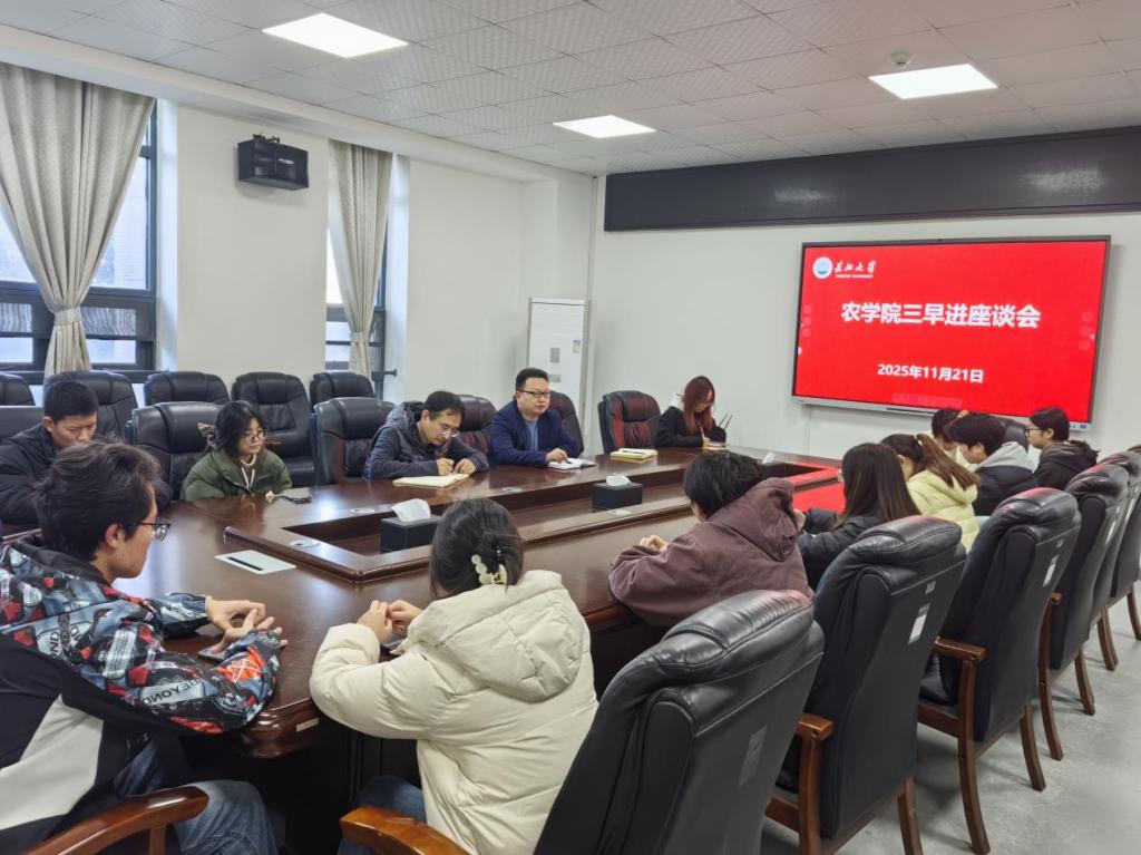 (通讯员 邹芮/文 唐玉婷/摄)为践行“厚德笃行、丰食天下”院训,深化我院“三早进”(早进课题组、早进实验室、早进试验田)工作,促进新生厚植学农爱农情怀,坚定强农兴农的时代使命,我院于11月21日中午12:30在农科大楼3064召开了三早进座谈会。党委副书记尹小华、副院长邓建新、辅导员唐玉婷以及2025级和2024级全体班长参加了此次会议。