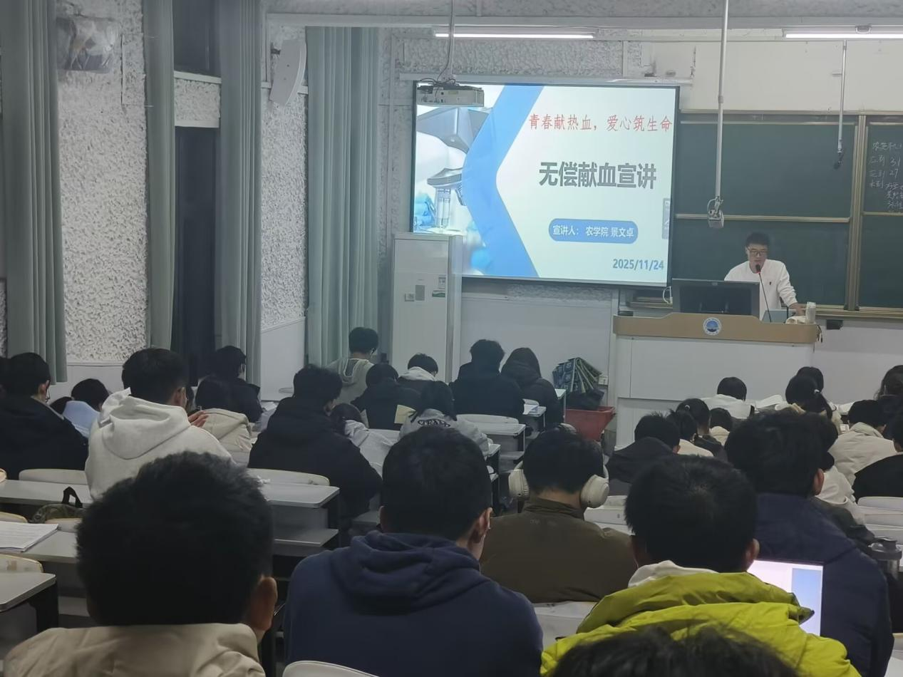 (通讯员 陈可欣 张国林/文 严树彬 方学斌 王浩源/摄)为弘扬无私奉献的志愿精神,普及无偿献血知识,引导青年学子以实际行动传递爱心,11月24日19:00,农学院社会实践部联合学校献血宣讲团,成功举办“热血青春,爱心传递”无偿献血专题讲座。2025级200余名本科生齐聚一堂,共同感受“献血救人,功在千秋”的责任与担当。