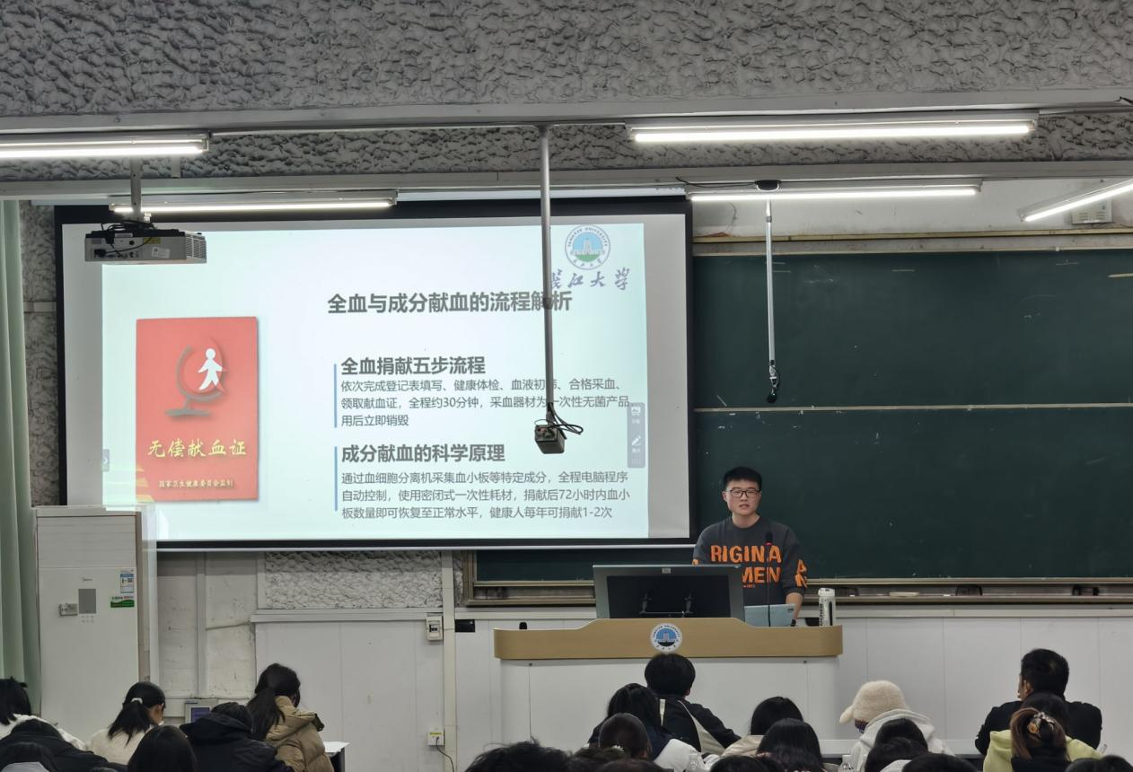 讲座现场,宣讲员景文卓以通俗易懂的语言,通过图文并茂的形式从无偿献血的意义、科学献血指南、无偿献血者权益和荆州血液现状等方面展开讲解,重点解答了“献血是否影响健康”“献血后如何科学恢复”“特殊人群献血注意事项”等学生关心的问题。破除了“献血伤身”的认知误区,让在场学子深刻认识到无偿献血是举手之劳的善举,更是青年应有的社会责任。